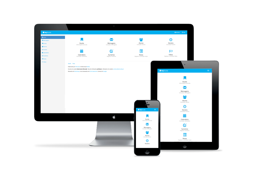 A aplicação web MyEscola foi pensada e programada para poder ser utilizada nos diversos dispositivos móveis entre os quais tables, telemóveis ou em qualquer computador pessoal.